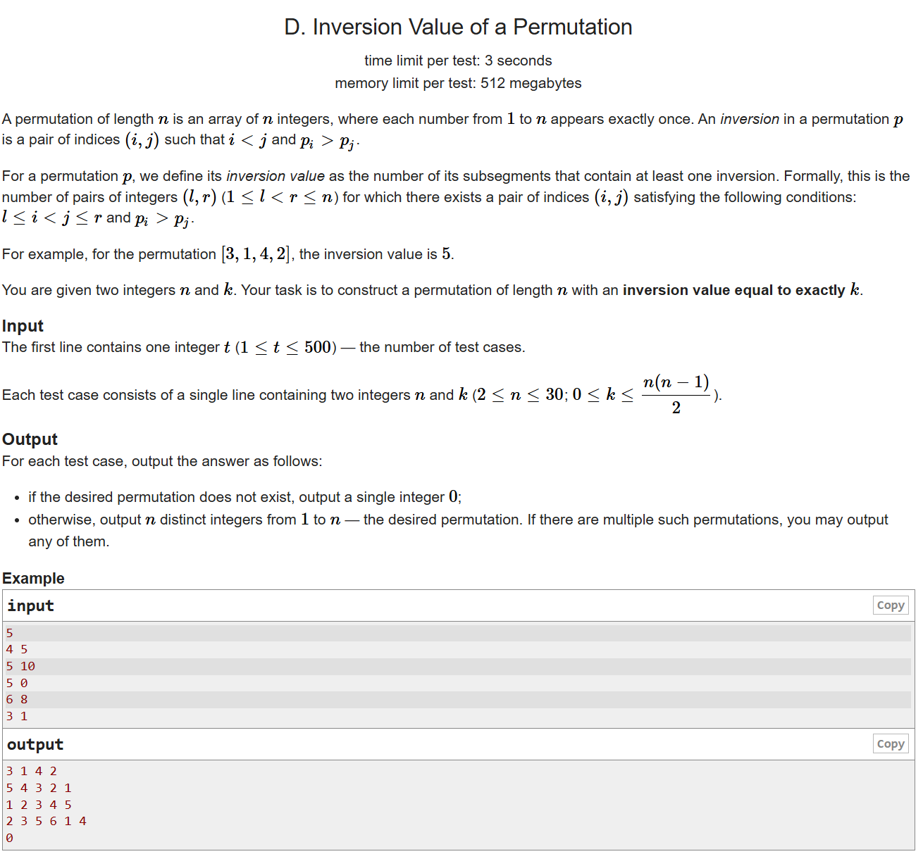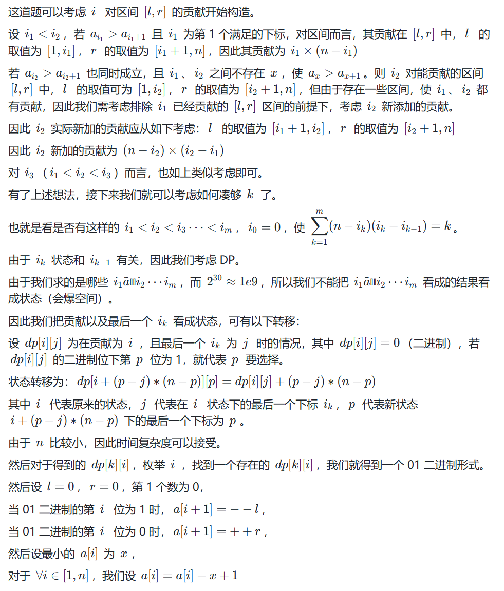 ll dp[M][N];void solve(){cin>>n>>r;ll ans=-1;for(int i=0;i<=n;i++)for(int j=0;j<=n*(n-1)/2;j++)dp[j][i]=-1;dp[0][0]=0;for(int i=1;i<n;i++){for(int j=0;j<=n*(n-1)/2;j++){for(int k=0;k<i;k++){int cx=i-k;int cy=n-i;if(dp[j][k]==-1)continue;dp[j+cx*cy][i]=dp[j][k]+(1<<i);}}}for(int i=0;i<n;i++){if(dp[r][i]!=-1){ans=dp[r][i];}}if(ans==-1)cout<<0<<'\n';else{int l=0,r=0;int x=0;for(int i=1;i<n;i++){if((ans>>i)&1){num[i+1]=--l;}elsenum[i+1]=++r;x=min(x,num[i+1]);}for(int i=1;i<=n;i++)cout<<num[i]-x+1<<' ';cout<<'\n';}