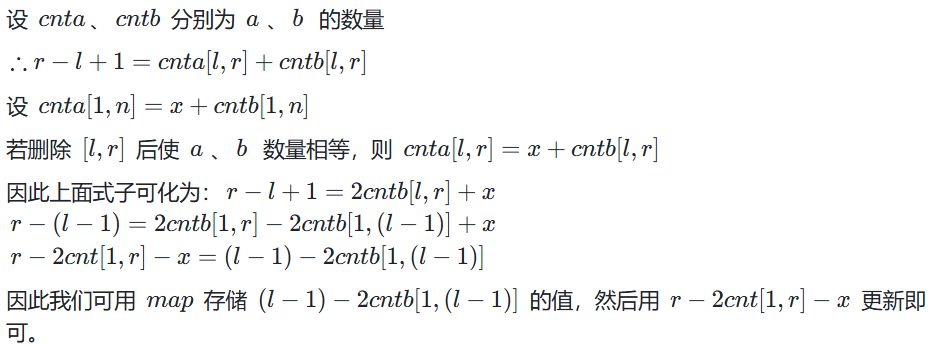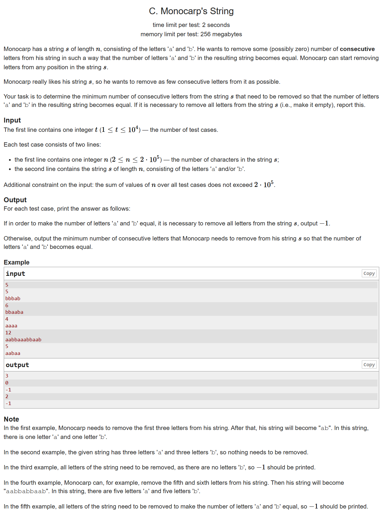 void solve(){map<int,int>cnt;cin>>n;cin>>s;for(int i=-2*n;i<=2*n;i++)cnt[i]=-1;int x=0,cb=0;for(auto c:s){if(c=='b')cb++;}cnt[0]=0;x=n-2*cb;int ans=n;int sum=0;for(int i=1;i<=n;i++){if(s[i-1]=='b')sum++; cnt[i-2*sum]=i; if(cnt[i-2*sum-x]!=-1)ans=min(ans,i-cnt[i-2*sum-x]);}if(ans==n)ans=-1;cout<<ans<<'\n';