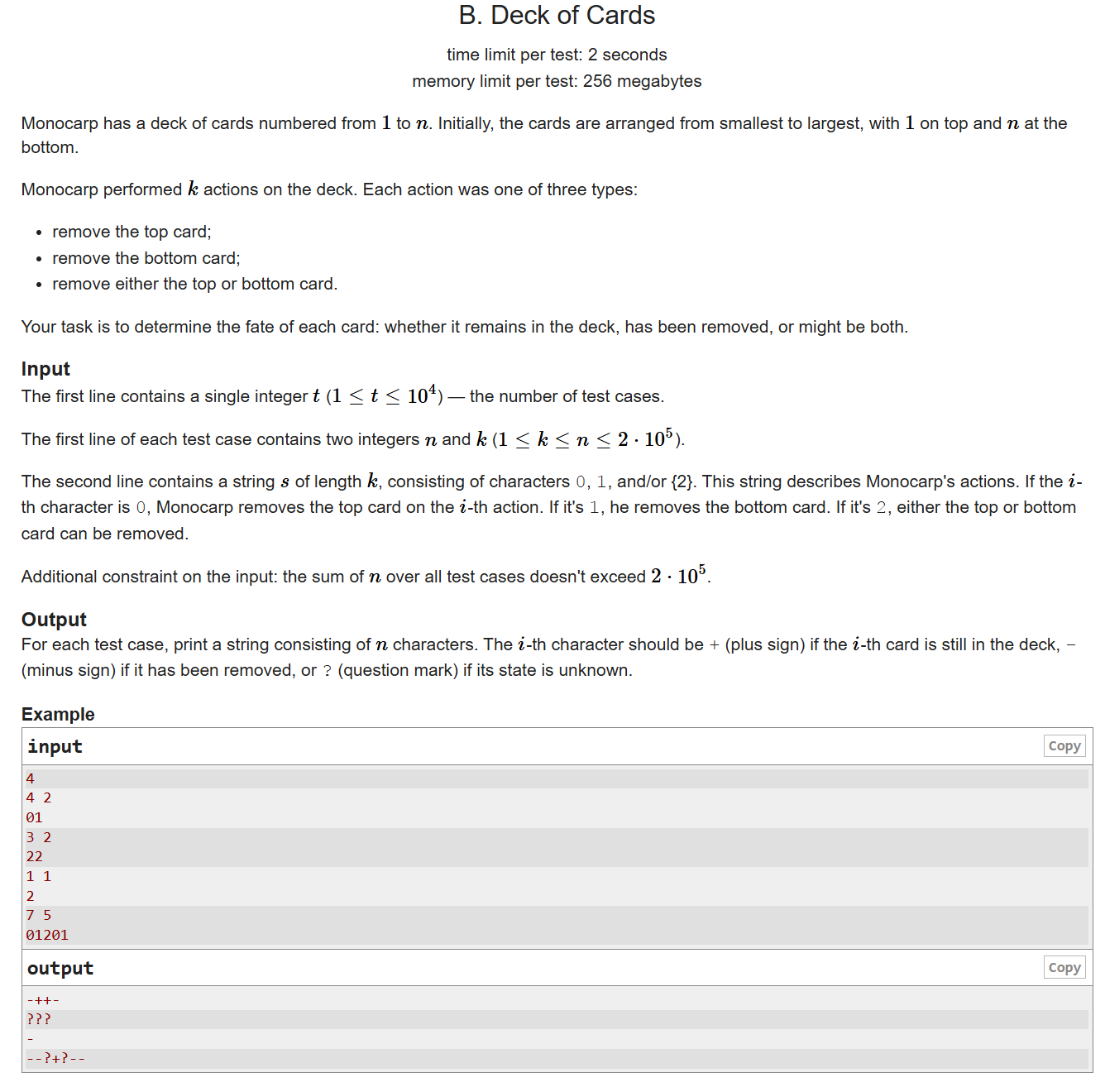 void solve(){cnt0=cnt1=cnt2=0;cin>>n>>k;string s,ans;cin>>s;if(n==k){for(int i=1;i<=n;i++)ans+='-';}else{for(auto c:s){if(c=='0') cnt0++;if(c=='1') cnt1++;if(c=='2') cnt2++;}for(int i=1;i<=n;i++){if(i<=cnt0||i>=n-cnt1+1)ans+='-';else if(i<=cnt0+cnt2||i>=n-cnt1-cnt2+1)ans+='?';elseans+='+';}}cout<<ans<<'\n';