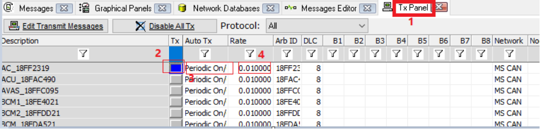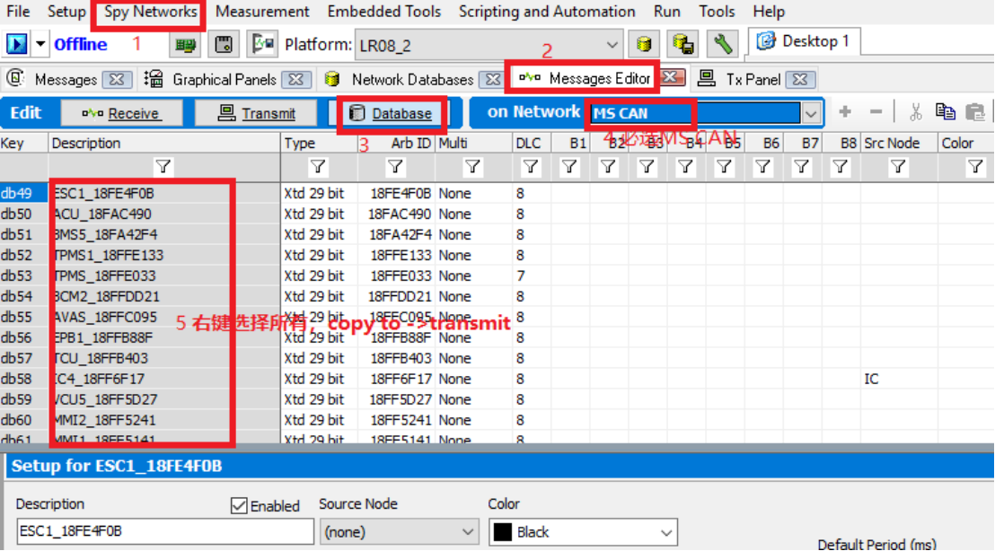 在Vehicle Networks →Message editor →Databases,右键点击Description→Copy To→Transmit: