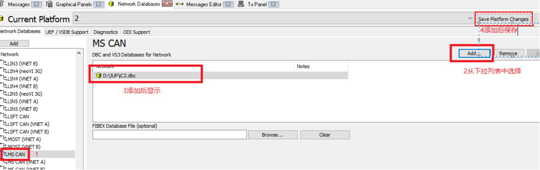 在左下栏network里,选择MS CAN,然后点击ADD,选择DBC文件,保存: