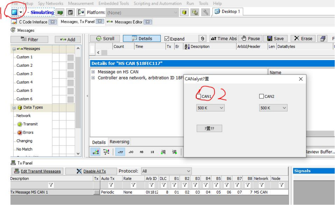 双击打开Demo,如下图:点击开启红色标记1,选择can1红色标记2