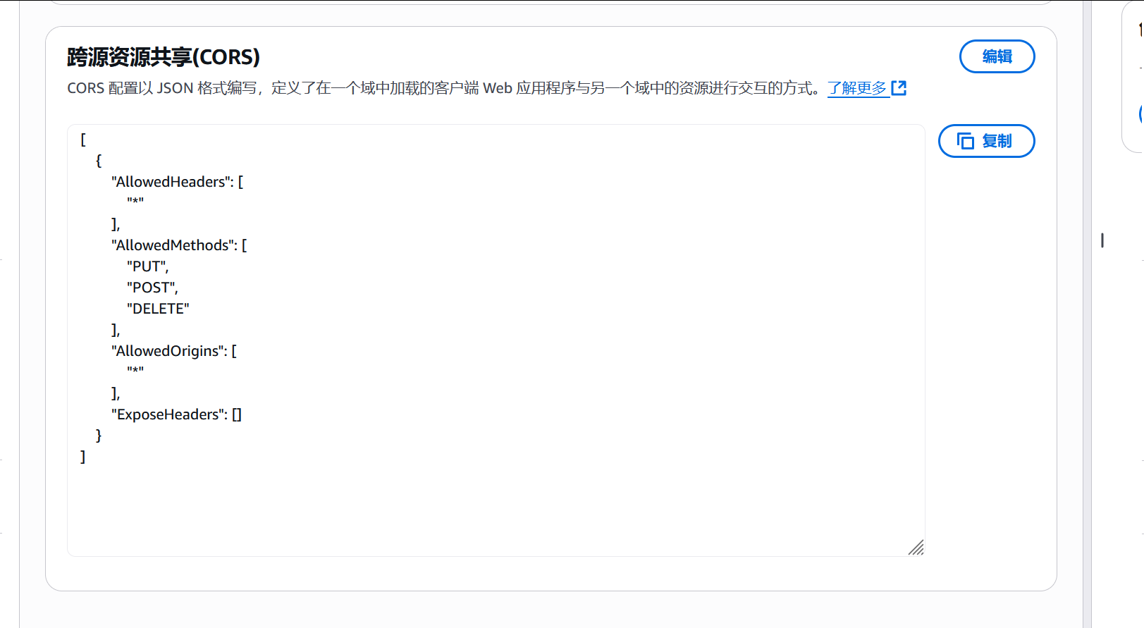 [{"AllowedHeaders": ["*"],"AllowedMethods": ["PUT","POST","DELETE"],"AllowedOrigins": ["*"],"ExposeHeaders": []}