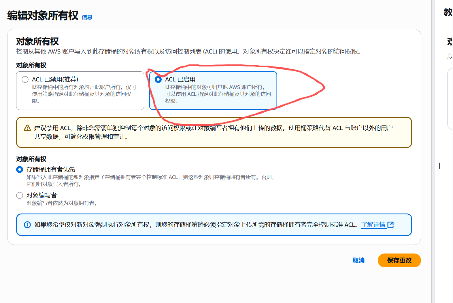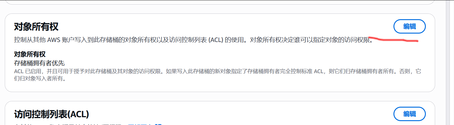 4. 对象所有权,添加为acl控制。 点击编辑