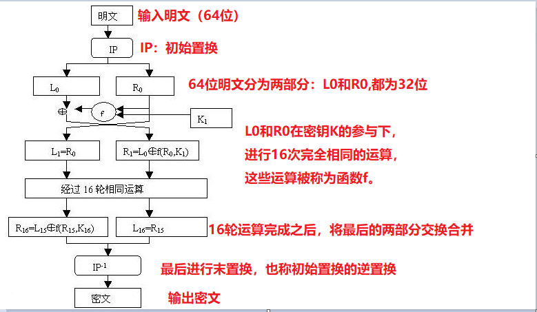 初始置换(IP置换):将输入的64位明文块进行置换和重新排列,生成新的64位数据块。