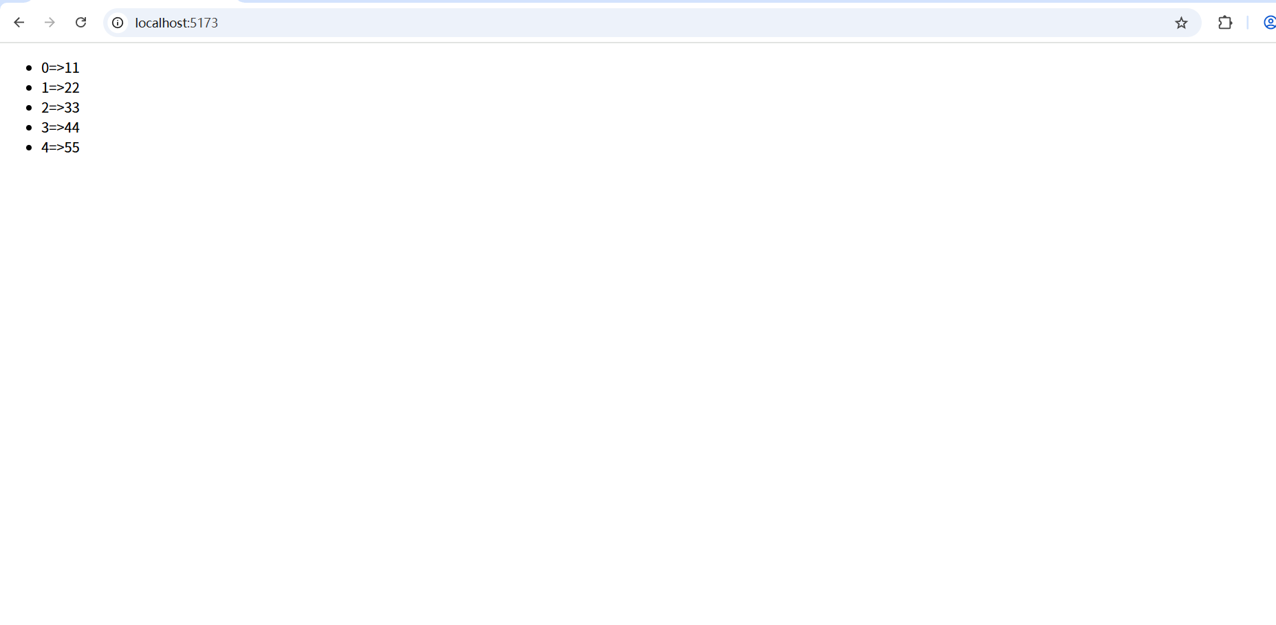 const arr=ref([11,22,33,44,55])</script><template><div><ul><li v-for="(item,index) in arr">{{ index }}=>{{ item }}</li></ul></div></template><style scoped></style>