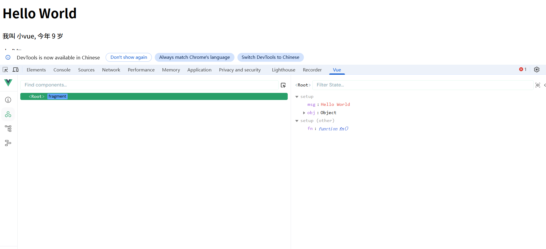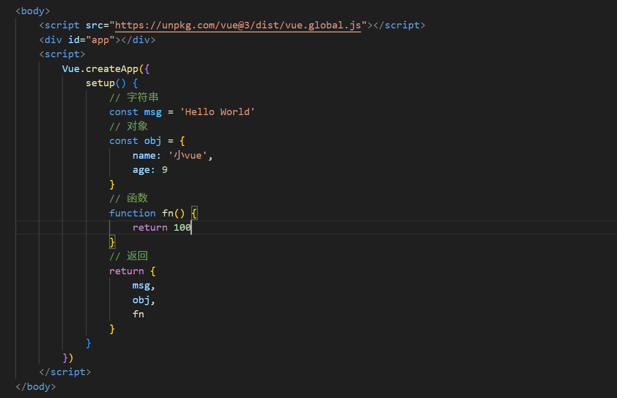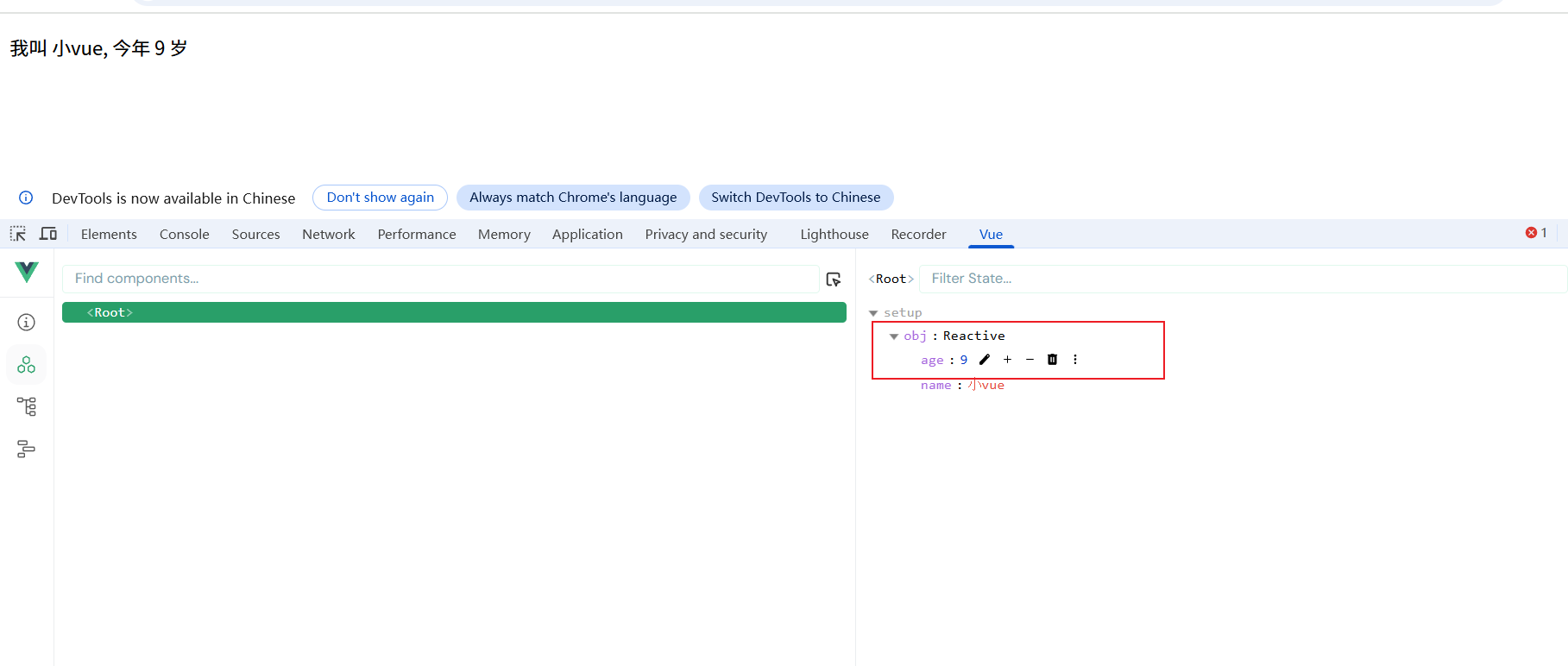 </head><body><script src="https://unpkg.com/vue@3/dist/vue.global.js"></script><div id="app"><p>我叫 {{ obj.name }}, 今年 {{ obj.age }} 岁</p></div><script>// 解构出 reactive 响应式函数const { createApp, reactive } = VuecreateApp({setup() {// 接收一个对象作为参数// 返回一个响应式对象(当对象的属性值变了, 视图会跟着变)const obj = reactive({name: '小vue',age: 9})return {obj}}}).mount('#app')</script>