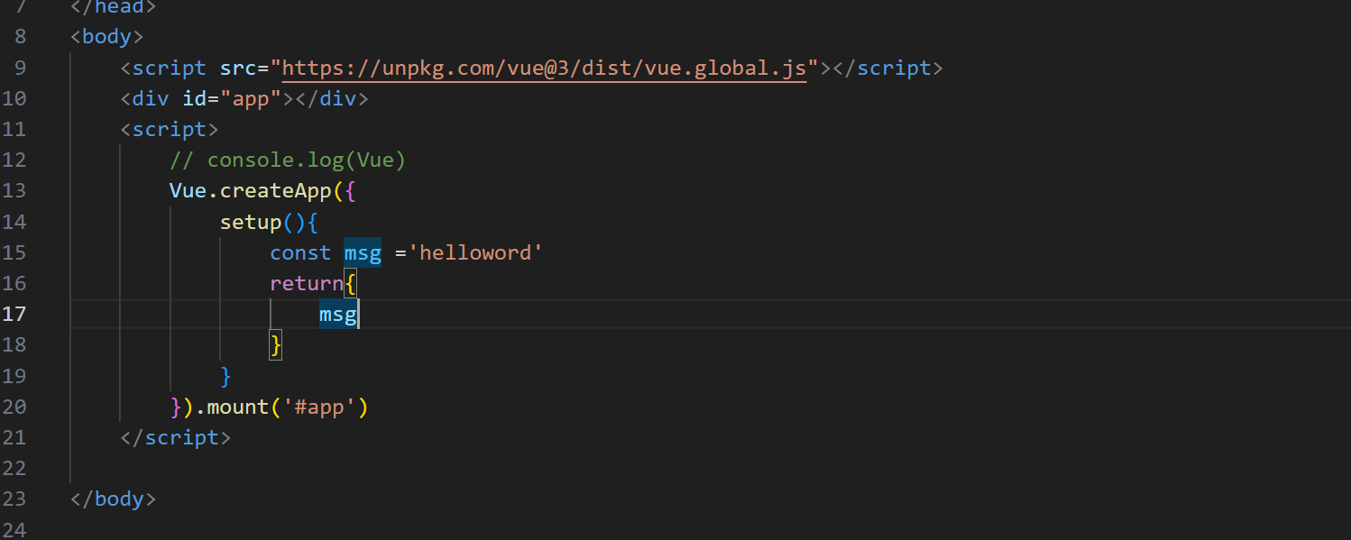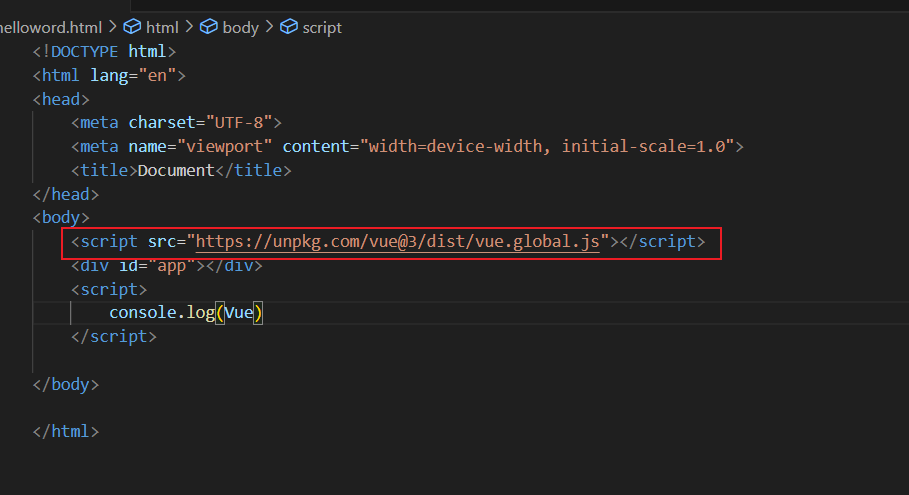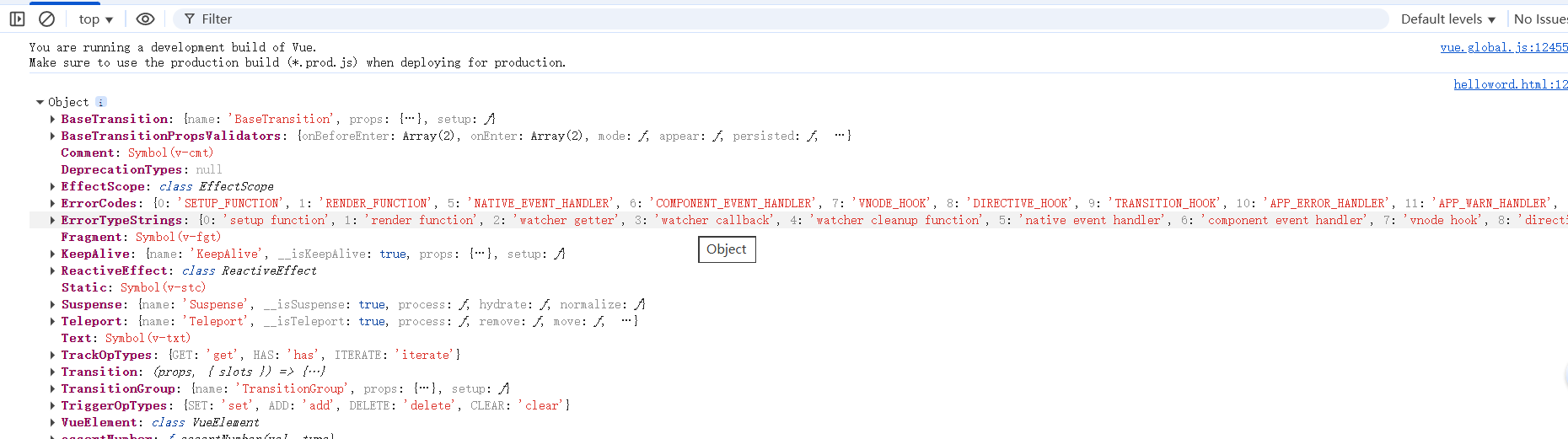 这个和我们之前学习前端一样,要引入vue3的源代码,可以下载后在本地引入,也可以引入在线的.我们可以来打印一下,结果如下图: