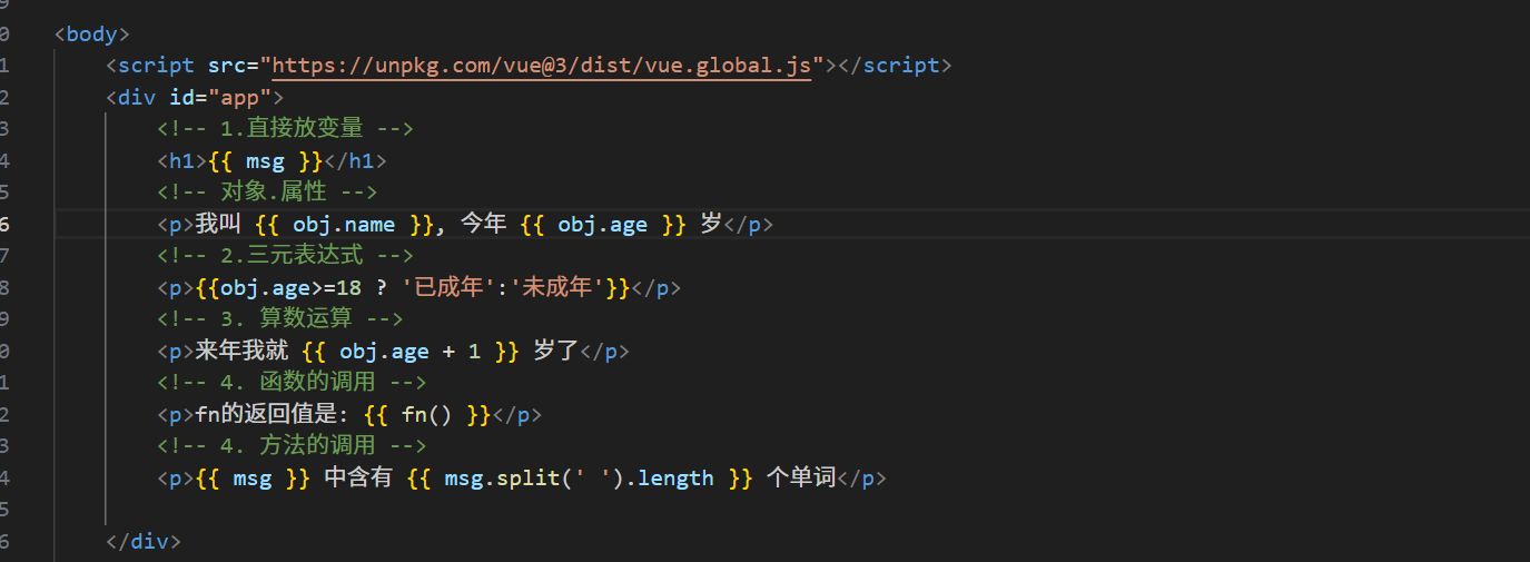 然后该说插值表达式了,也可以叫声明式渲染,就是我们上面代码中写的两个双花括号:{{}}.这里要注意一下就是,这个只能用在双标签中,需要被包裹住,但单标签是不行的.下面我用代码来演示: