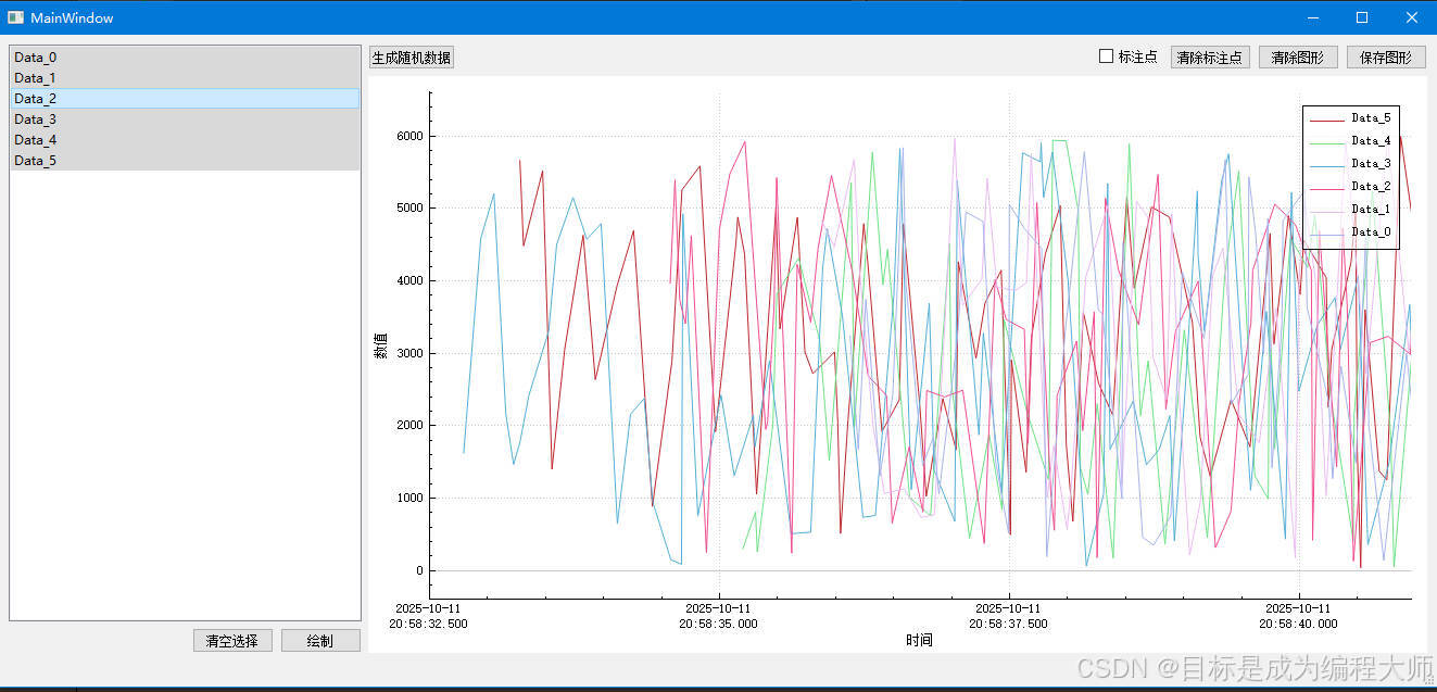 }void MainWindow::on_generate_clicked() {//生成随机数据m_data.clear();ui->listWidget->clear();int count = generateRandomInt(5, 10);for (int i = 0; i < count; ++i) {QString name = QString("Data_%1").arg(i);qint64 ct = QDateTime::currentMSecsSinceEpoch();int itemCount = generateRandomInt(50, 100);QHash<QDateTime, double> dataHash;for (int j = 0; j < itemCount; ++j) {int step = generateRandomInt(5, 200);ct -= step;dataHash.insert(QDateTime::fromMSecsSinceEpoch(ct),generateRandomDouble(0.0, 6000.00));}m_data.insert(name, dataHash);QListWidgetItem *newItem = new QListWidgetItem;newItem->setText(name);ui->listWidget->addItem(newItem);}