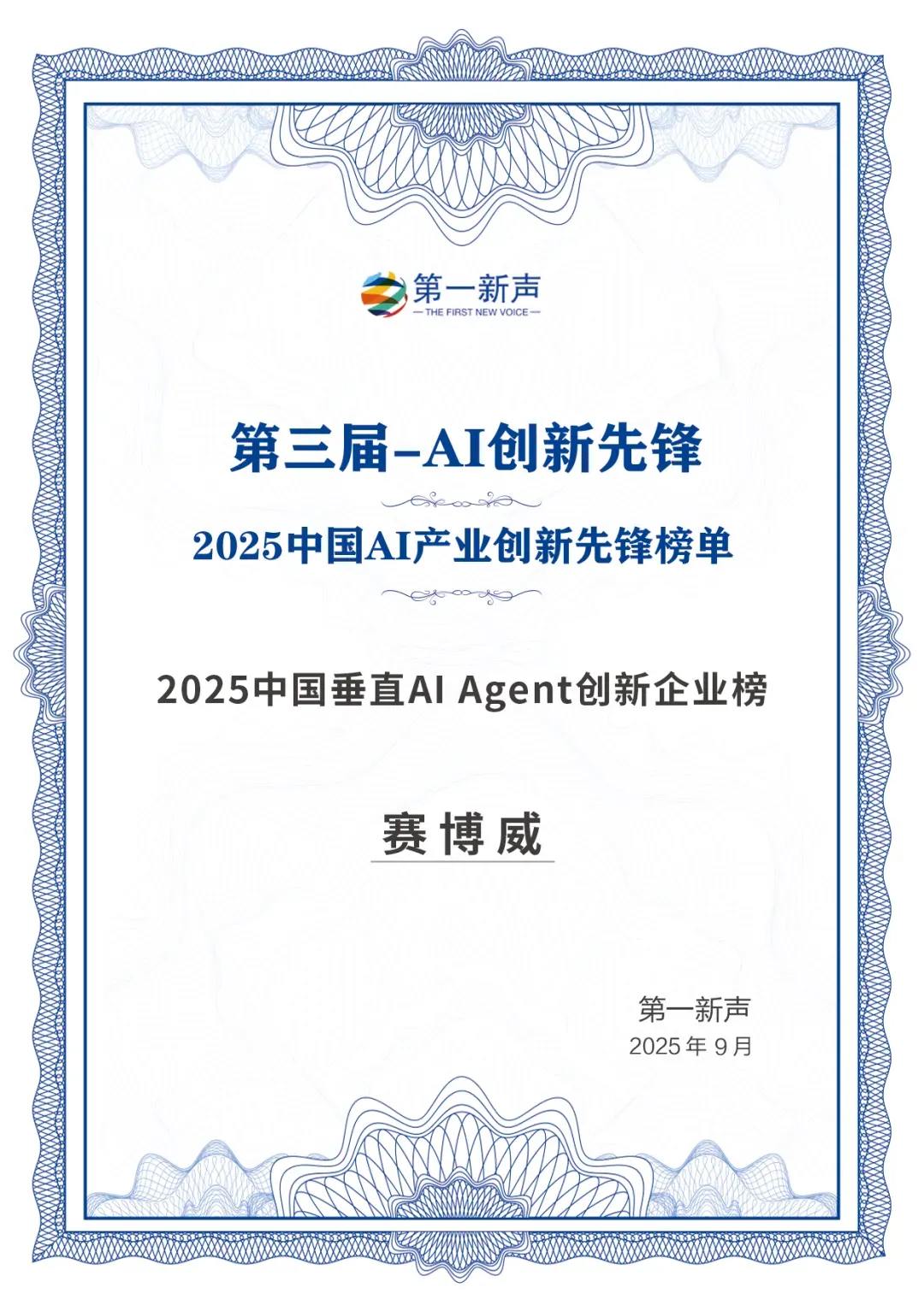 近日,第一新声智库正式发布《2025年全球企业级AI Agent优秀厂商图谱》和《2025中国AI产业创新先锋榜单》,在这两项重磅评选中,赛博威斩获双重肯定,再次彰显了作为AI领域创新先锋的出众实力。