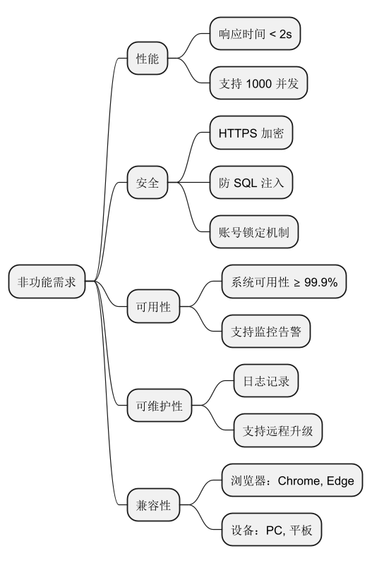 性能 | 支持1000并发用户,平均响应时间 ≤ 2s |