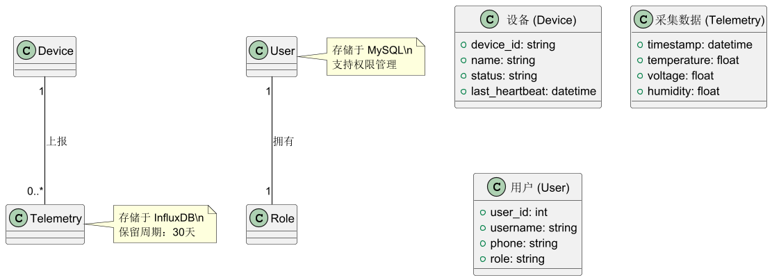 主要功能:设备数据采集、实时分析、用户权限管理、报表生成。