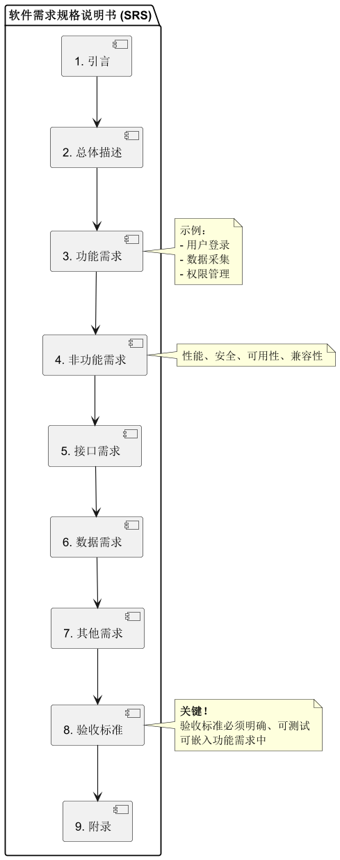 随着软件系统复杂度的提升,清晰、完整、可验证的需求文档已成为项目成功的关键。本文详细说明了 SRS 应包含的七大核心模块:引言、总体描述、功能需求、非功能需求、接口需求、数据模型与其他需求,并特别强调了验收标准的重要性——这是确保需求可测试、可交付的核心环节。