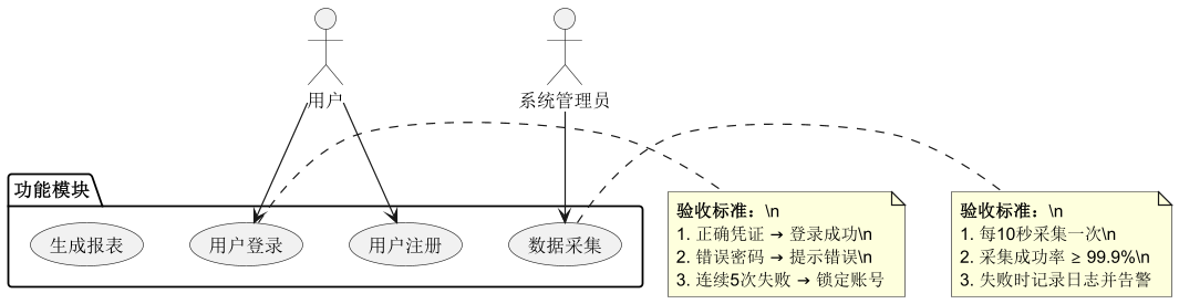 - 推荐嵌入式写法:每条功能下直接列出验收标准,便于追踪。