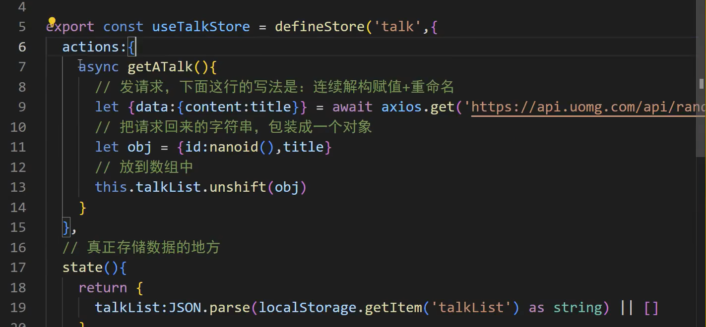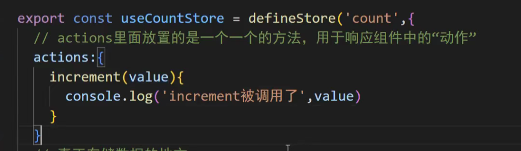export const useCounterStore = defineStore('counter', {state: () => ({ count: 0, history: [] }),// 定义 actionsactions: {increment() {this.count++ // 通过 `this` 访问整个 store 实例},decrement() {this.count--},randomReset() {const newCount = Math.round(Math.random() * 100)this.count = newCountthis.history.push(`Randomly reset to ${newCount}`)}}
