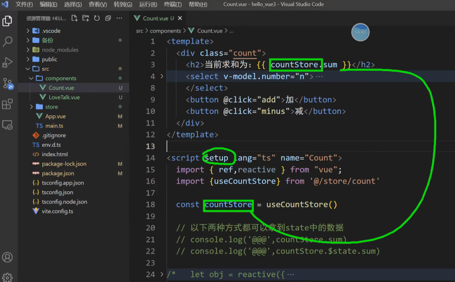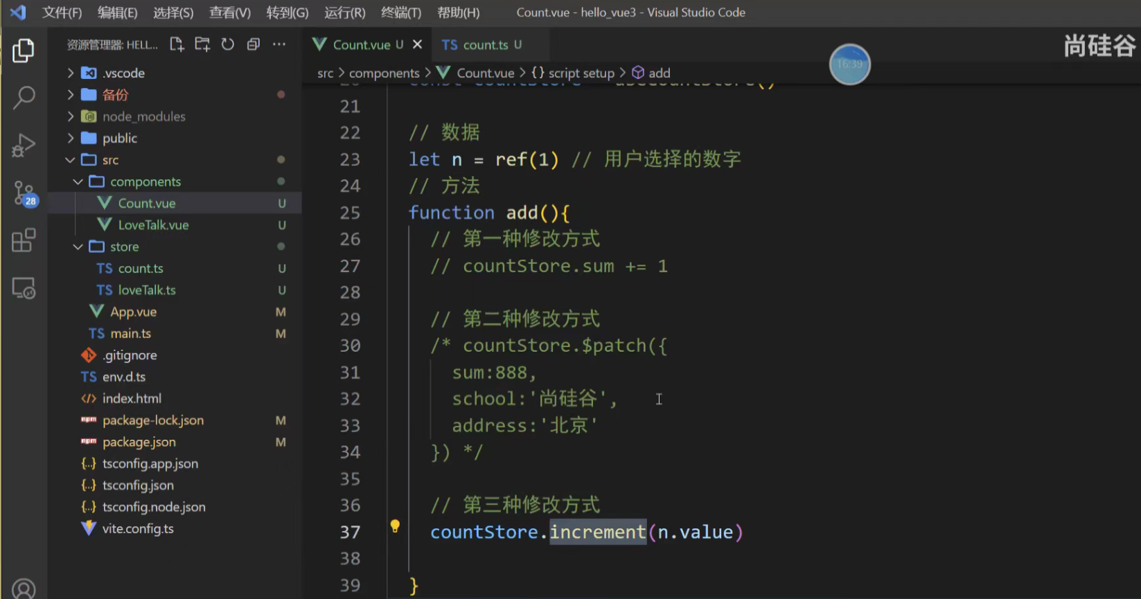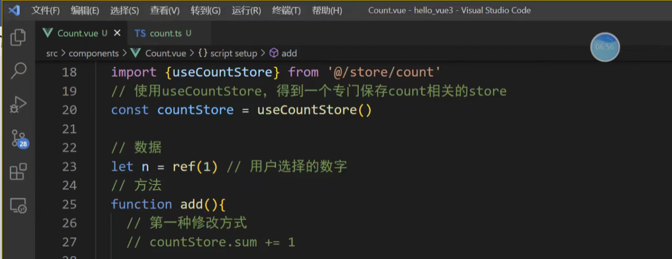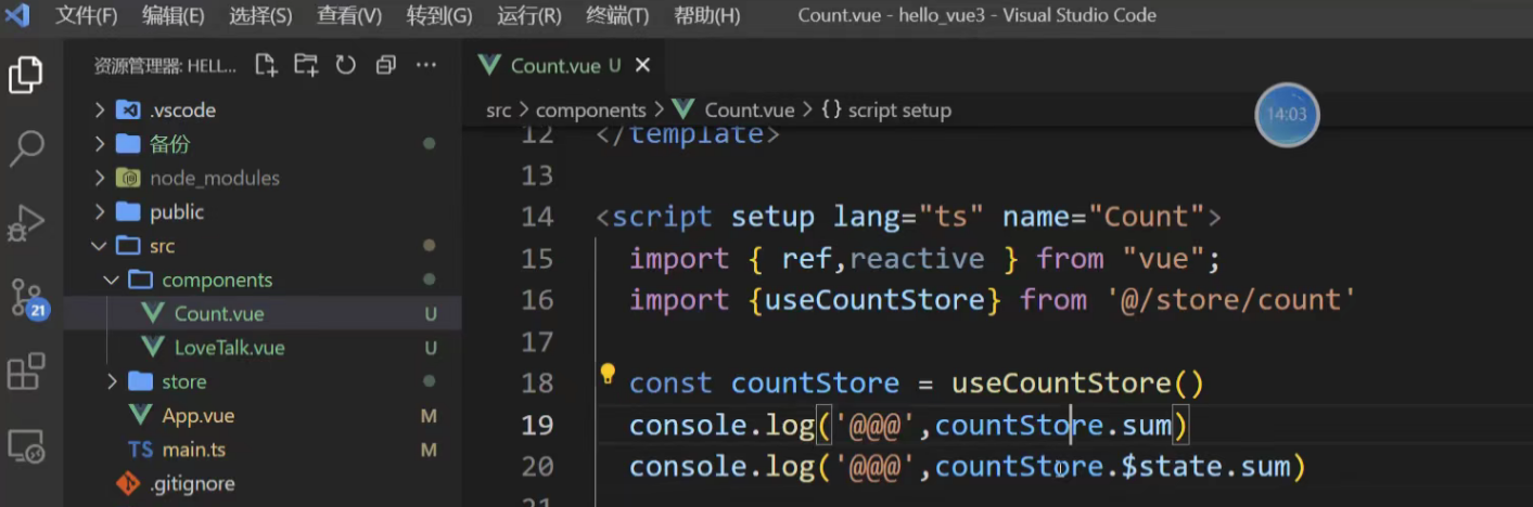 import { useCounterStore } from '@/stores/counter'// 在 setup 中调用 use...Store 函数实例化 store