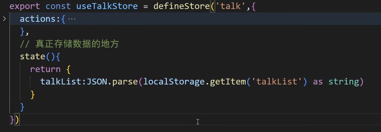 export const useCounterStore = defineStore('counter', {// State 是一个返回初始状态的函数state: () => {return {count: 0,history: [] // 用于记录操作历史,演示 $subscribe}},
