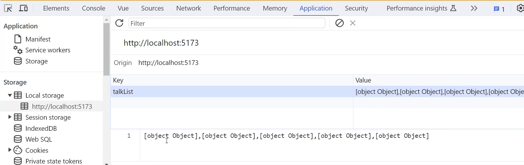 localstorage底层都是字符串,如果不是字符串会调用tostring方法,如果传的数组里面都是对象就会变成下面这样