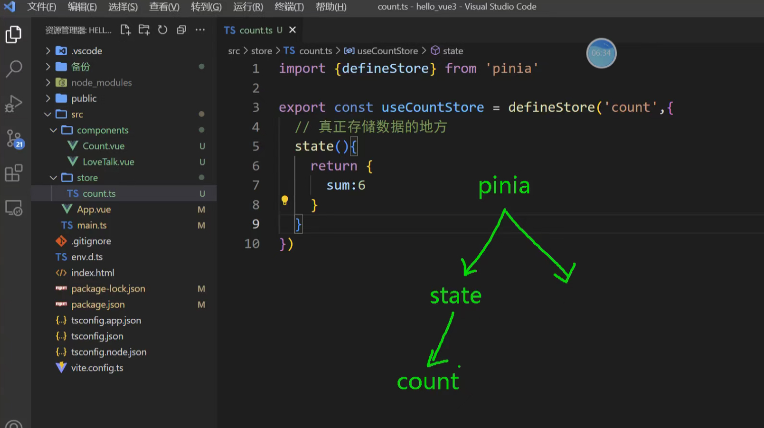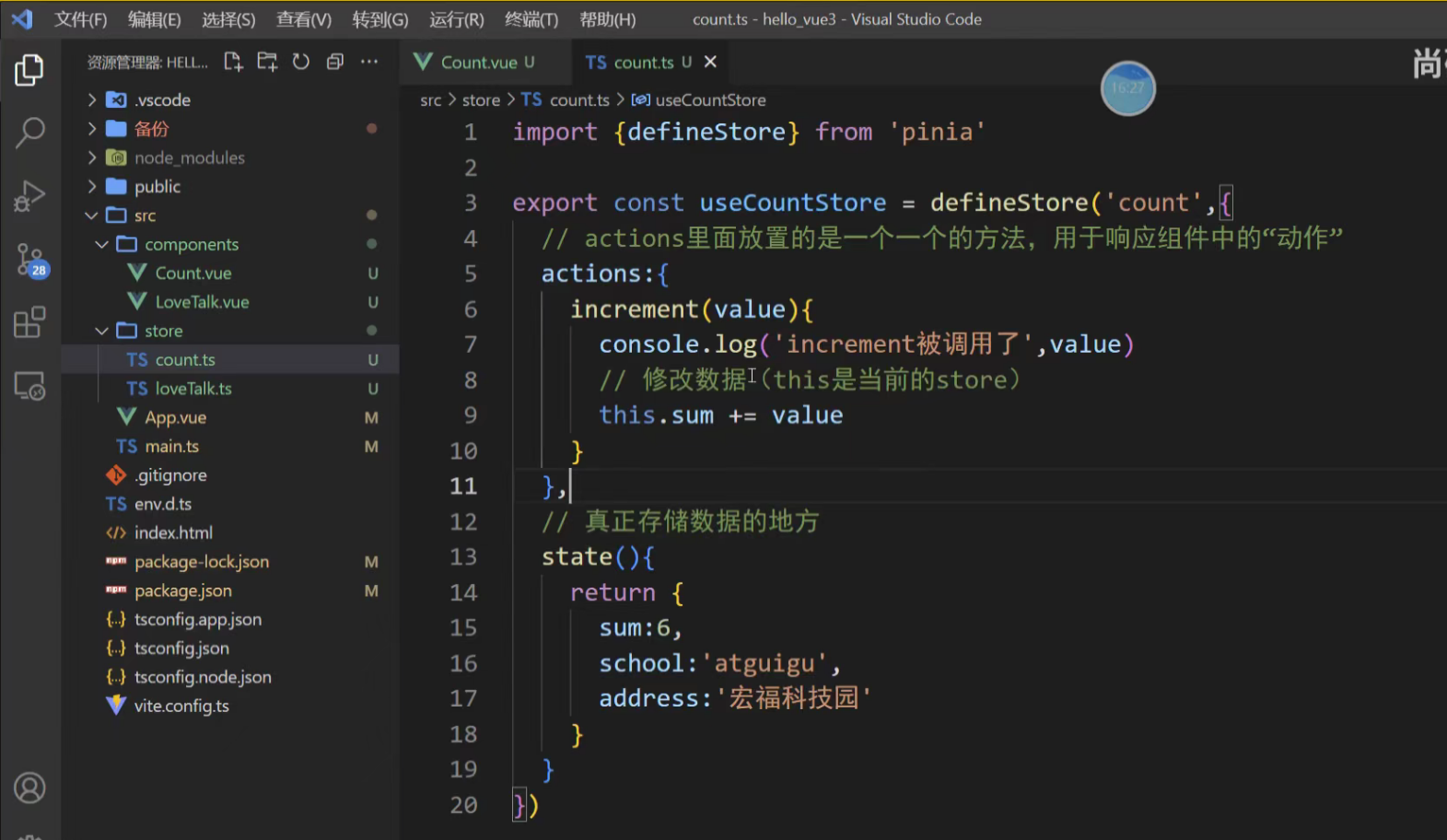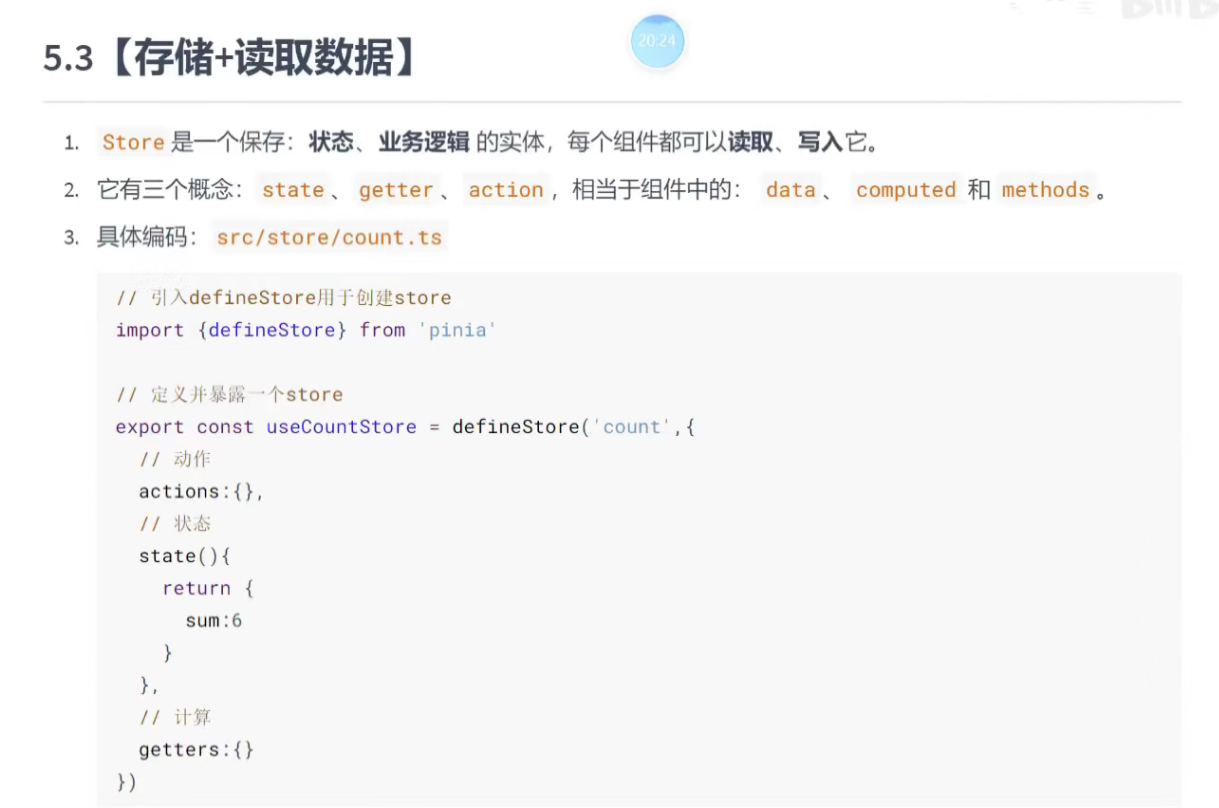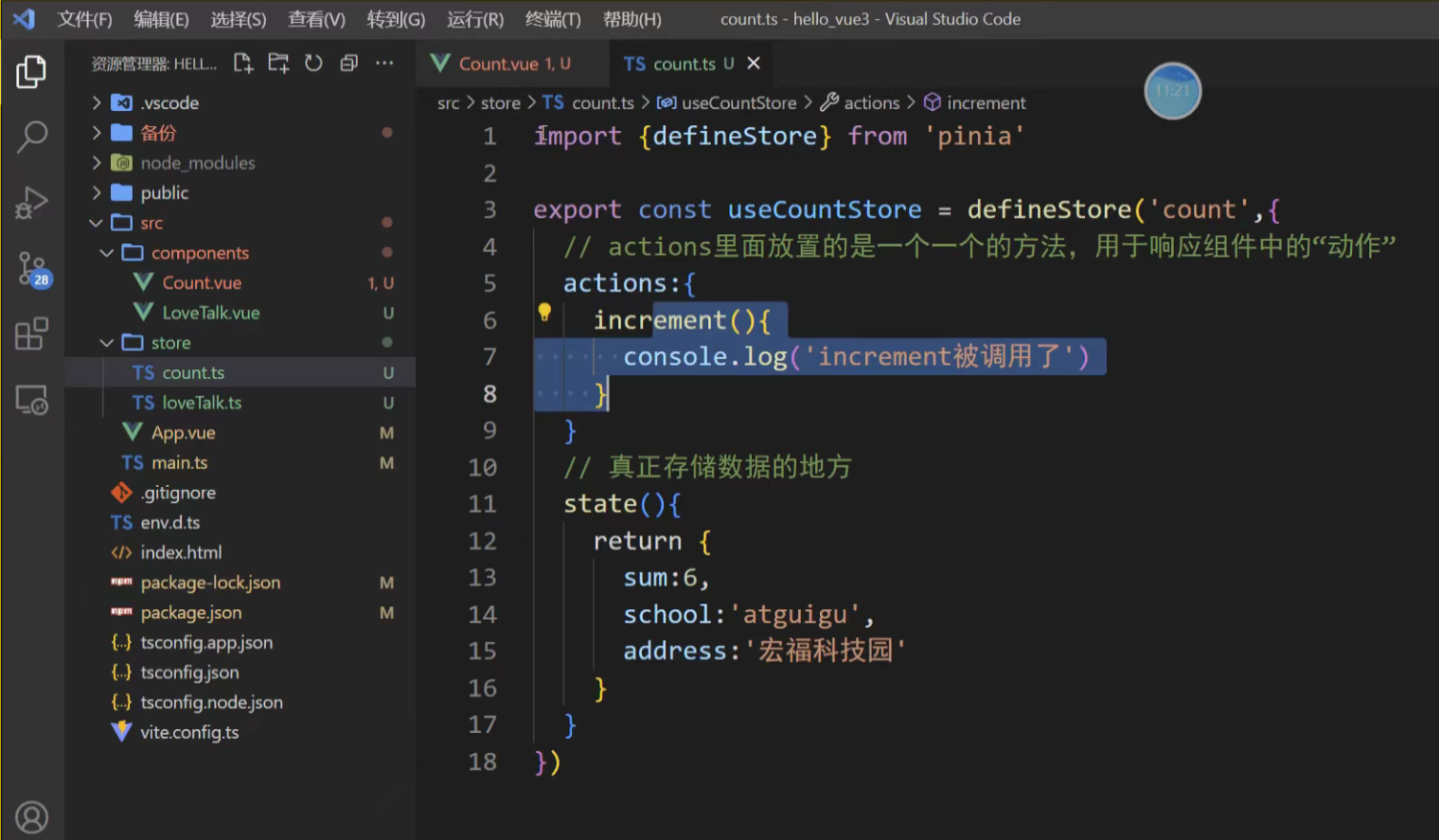 函数的语法来定义 Store,这与 Vue 3 的 Composition API 思想一致。
