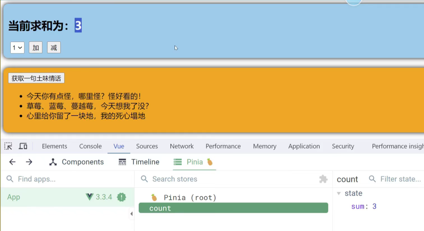 我们将构建一个简单的计数器应用来演示 Pinia 的各个功能。这个应用包含: