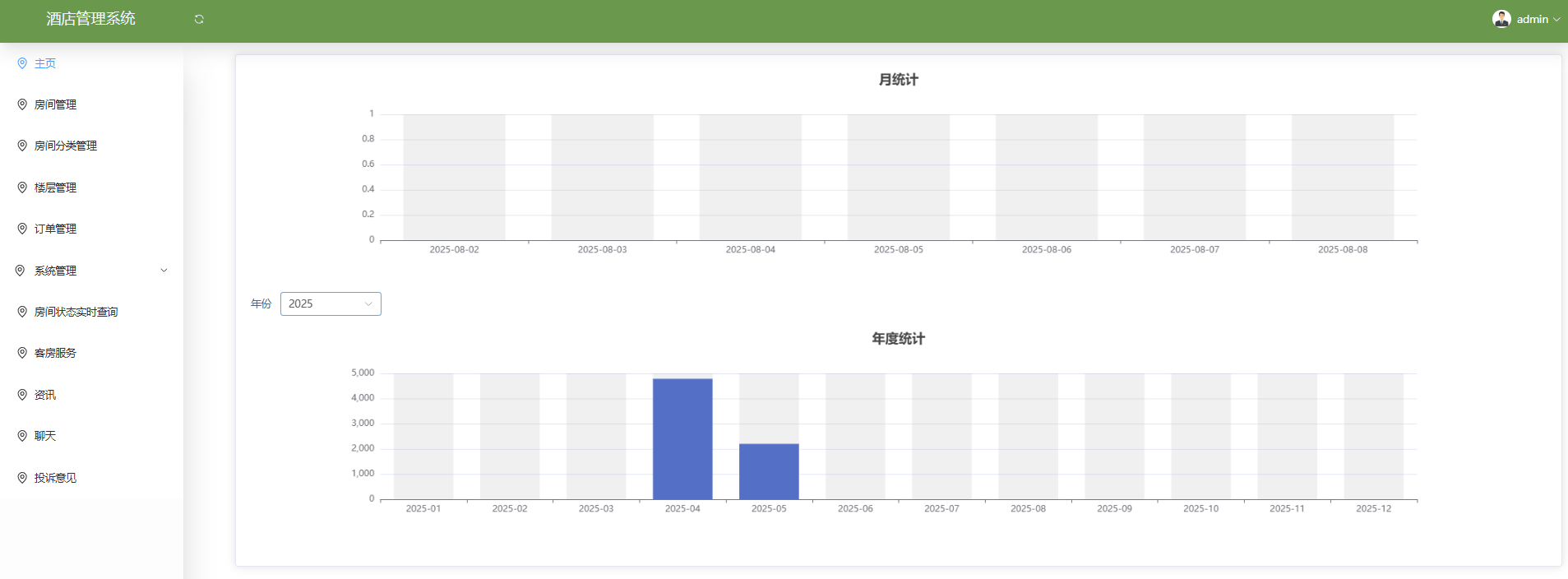 管理员端的数据可视化功能设计直观清晰,提供月度和年度统计图表。管理员可选择不同年份查看数据变化趋势,帮助管理者实时掌握酒店运营状况,进行科学决策和优化管理,提升整体运营效率和服务质量。