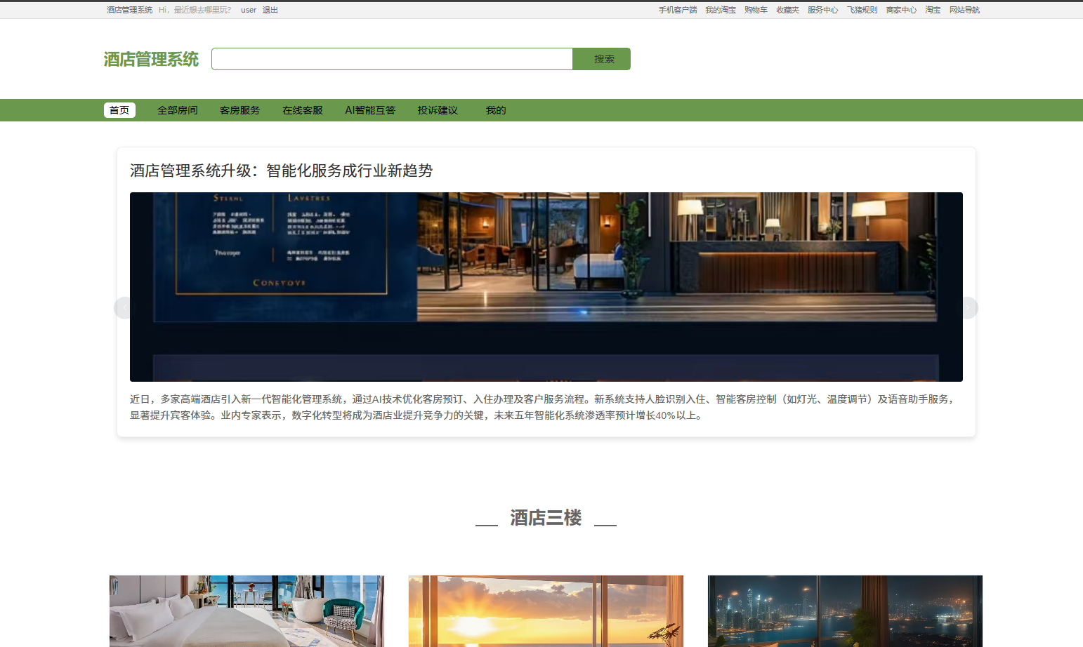 用户端首页设计简洁明了,展示酒店管理系统升级的智能化服务介绍和酒店三楼的精美图片。页面顶部提供搜索功能,方便用户快速查找信息。导航栏包含全部房间、查房服务等选项,用户可便捷访问所需服务,提升使用体验和满意度。
