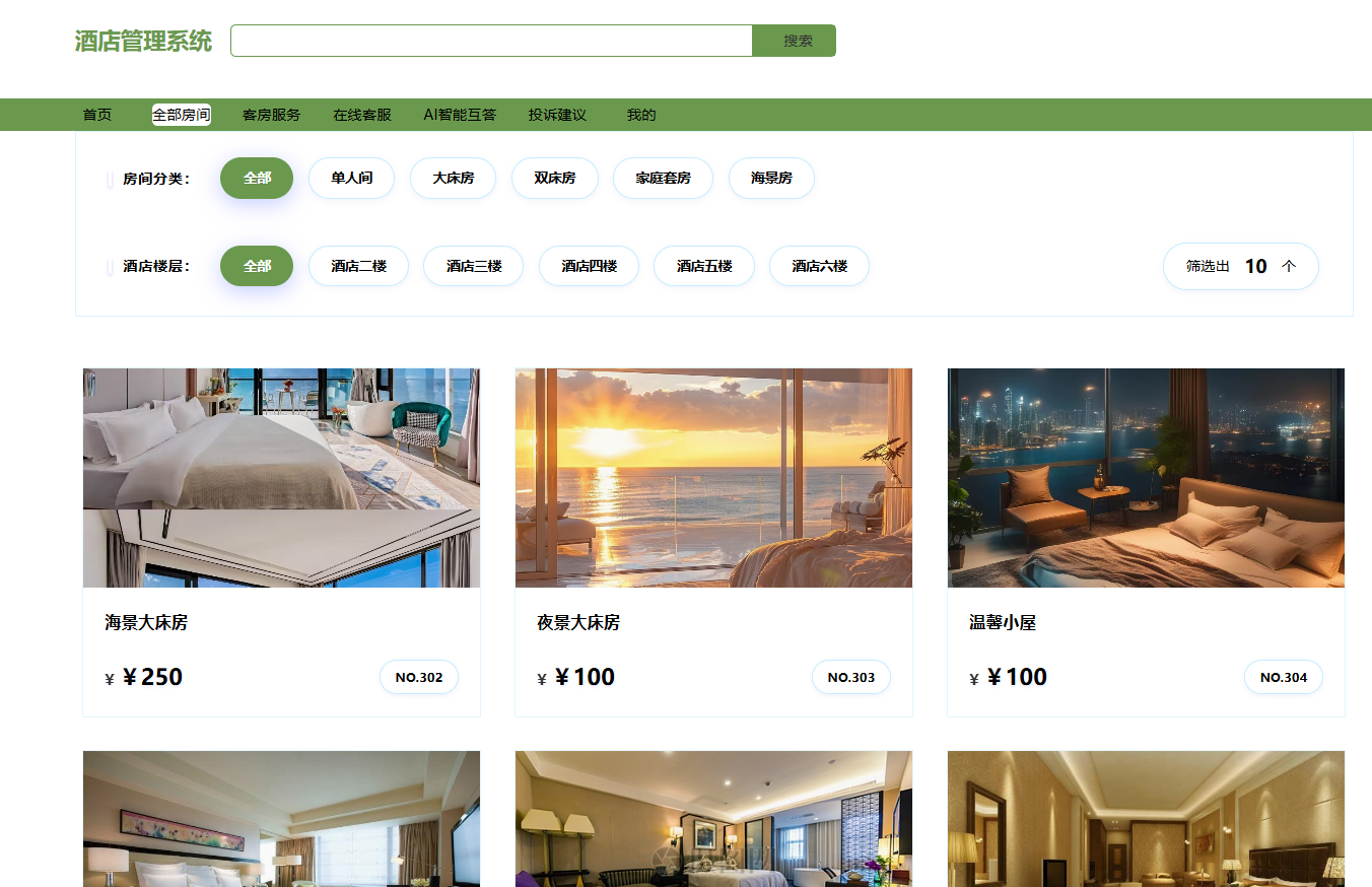 用户端的搜索与查看房间功能页面提供分类和楼层筛选,用户可快速查找所需房型。每间房展示图片、价格和编号,点击即可查看详情。