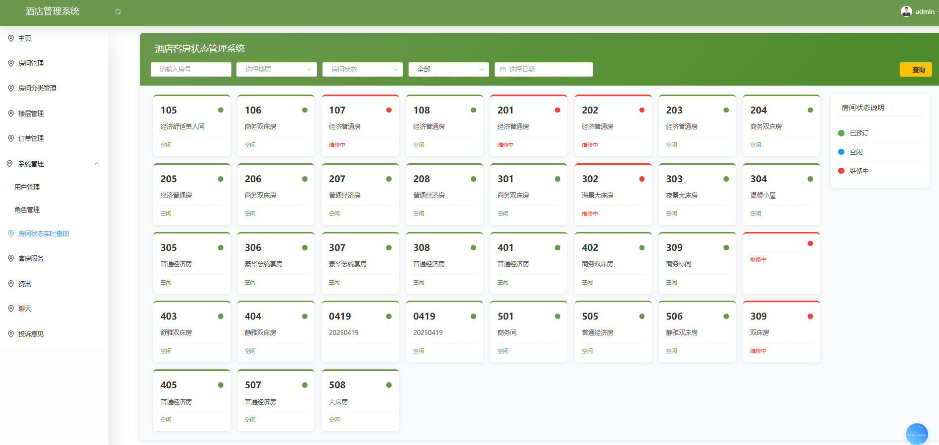 管理员端的房间状态实时查询功能设计直观高效,页面展示各房间的预订、空闲和维修状态。通过筛选条件如房号、楼层和日期,管理员可快速查找所需信息