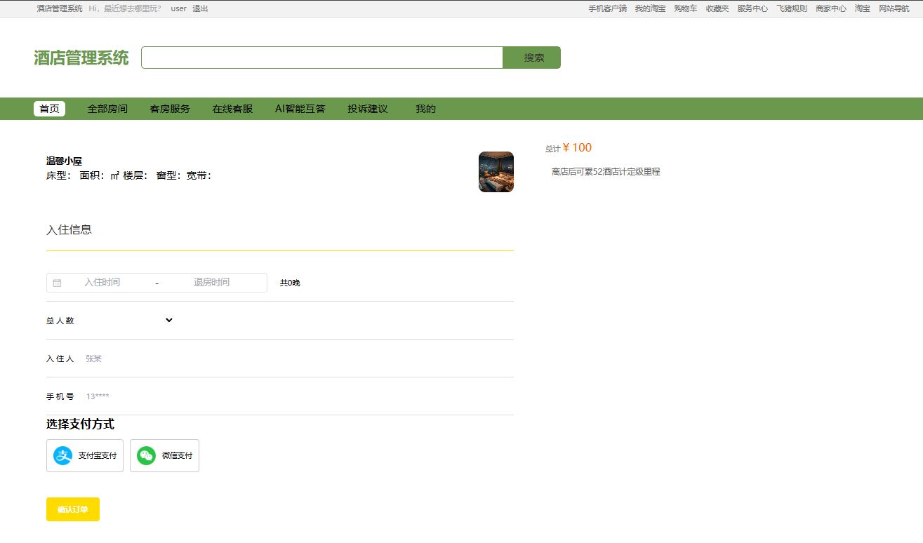 用户端的预定房间功能设计简洁实用,页面展示房间信息、入住和退房时间选择、总人数及联系方式填写。支持支付宝和微信支付方式,操作便捷。