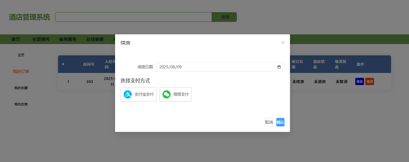用户端的续房功能页面展示续房日期选择和支付方式选项,用户可轻松选择支付宝或微信支付,并确认续房操作。列表显示订单状态,包括续订日期、退房状态等信息,方便用户随时查看和管理。