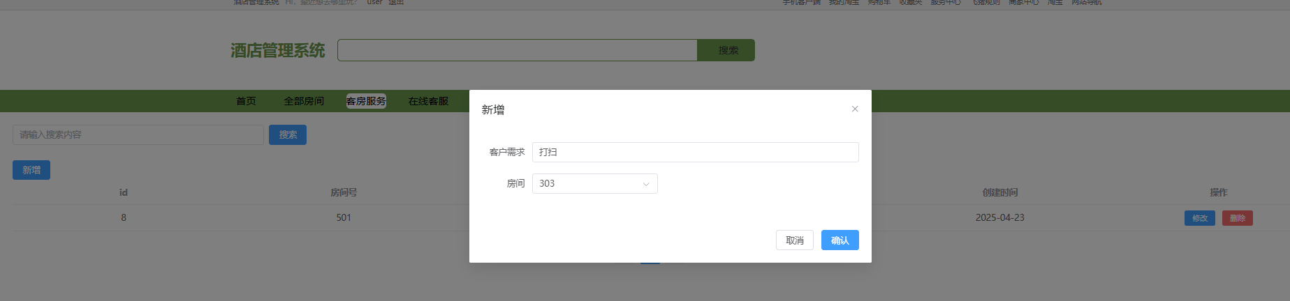 用户端的客房服务功能页面提供搜索和新增服务选项,用户可输入需求并选择房间号,提交后系统记录服务请求。列表展示所有服务信息,包括ID、房间号和操作按钮,方便用户查看和管理,提升服务体验和效率。