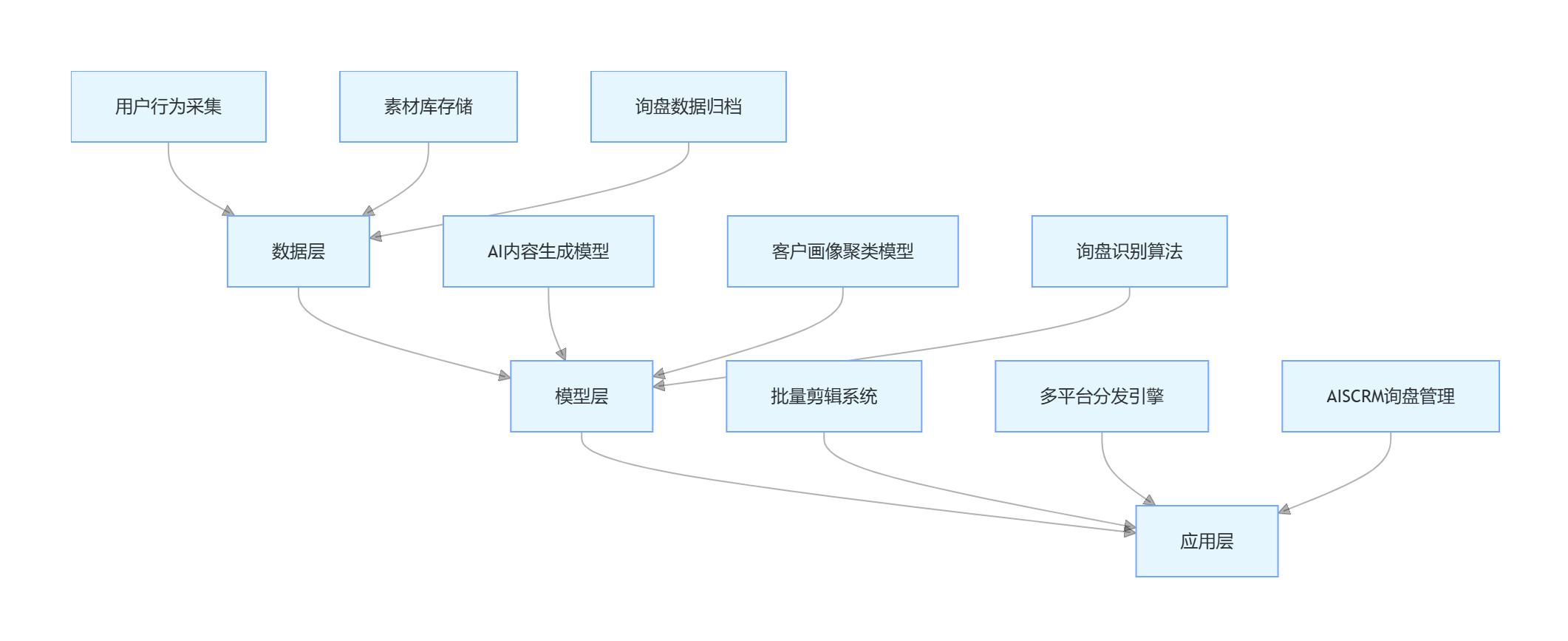 - 应用层:核心含四大引擎(成片 / 分发 / 回复 / 分析),支持 8 大平台一键分发。
