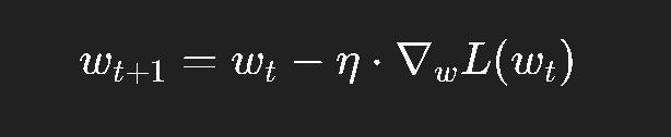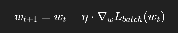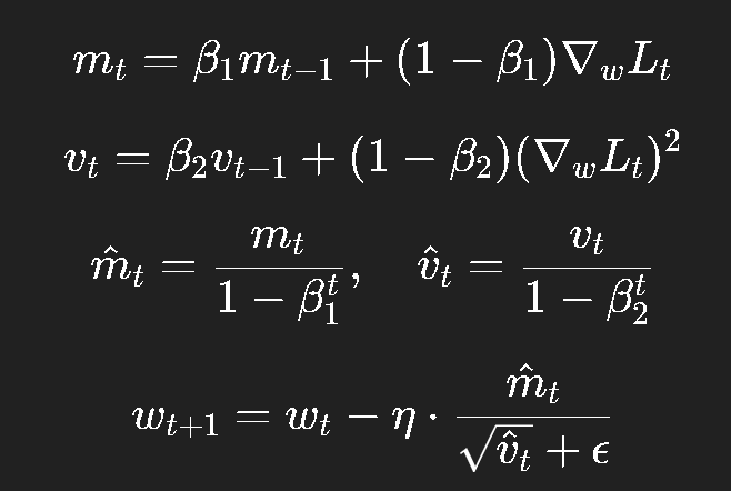 m, v = 0, 0 for each batch:grad = compute_gradient(L, w)m = beta1 * m + (1 - beta1) * gradv = beta2 * v + (1 - beta2) * grad**2m_hat = m / (1 - beta1**t)v_hat = v / (1 - beta2**t)w = w - lr * m_hat / (sqrt(v_hat) + eps)