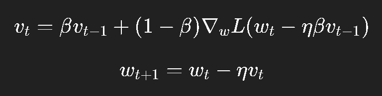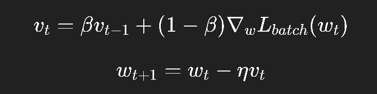 for each batch:grad = compute_gradient(L, w)v = beta * v + (1 - beta) * gradw = w - lr * v