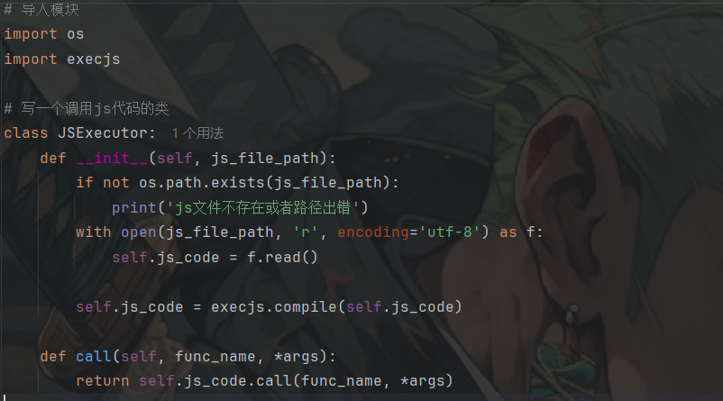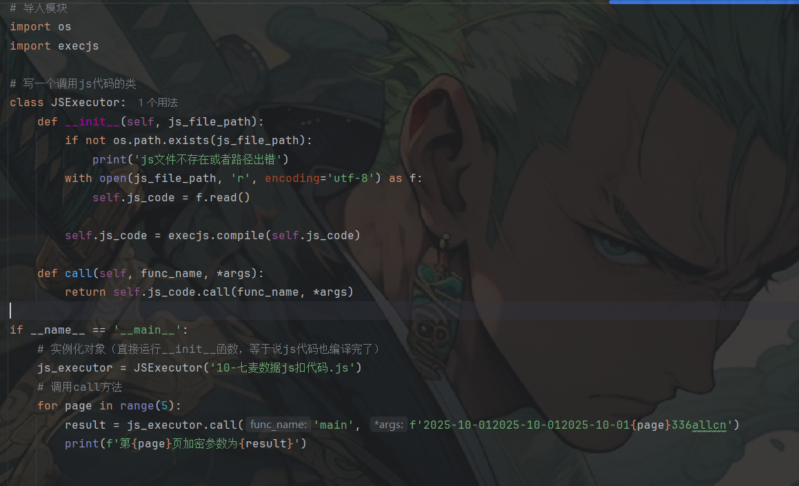 class JSExecutor:def __init__(self, js_file_path):if not os.path.exists(js_file_path):print(f'js代码不存在:{js_file_path}')with open(js_file_path, 'r', encoding='utf-8') as f:self.js_code = f.read()# execjs.compile() 将JavaScript 代码编译为一个可执行的对象self.js_code = execjs.compile(self.js_code)def call(self, func_name, *args):"""封装python对js代码中函数的调用:param func_name: js代码中的函数名:param args: js代码中函数所需的参数:return: js中函数运行后的结果"""return self.js_code.call(func_name, *args)if __name__ == '__main__':# 加载js文件js_exec = JSExecutor('js路径.js')# 调用js中函数result_func_js = js_exec.call('func_in_js', ['param1', 'param2'])print("js代码运行结果为:", result_func_js)