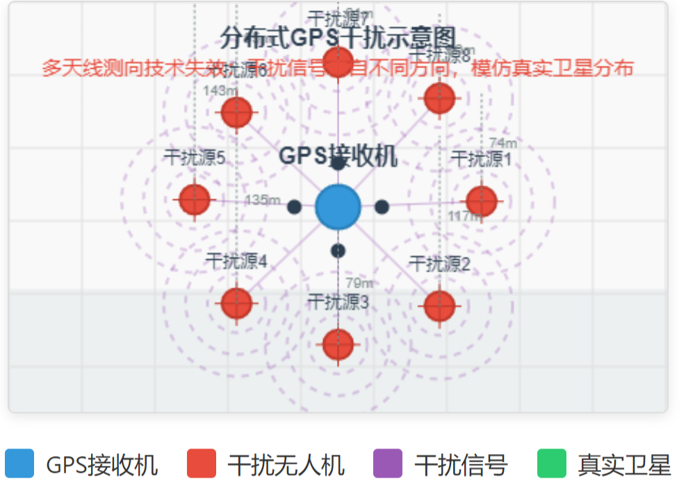 如果我们在不同的位置(比如多个无人机)上放置多个欺骗是干扰发生器,每个干扰发生器只模拟一个卫星信号或少数几个卫星信号,从而在空间角度上模仿真实卫星的分布,那么,多阵列天线测向结果就不存在所有信号来向相同或接近的情况,抗干扰就失效了。