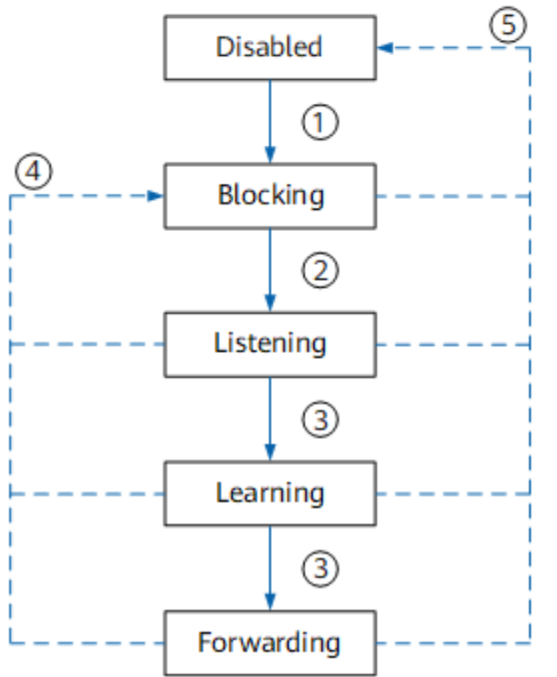 3 | 设备将计算出的配置消息与端口自身的配置消息进行比较: • 若计算出的配置消息更优,则该端口成为 指定端口(Designated Port),并周期性发送 BPDU; • 若端口自身的配置消息更优,则该端口被阻塞(Discarding / Blocking),仅接收不发送 BPDU。 |