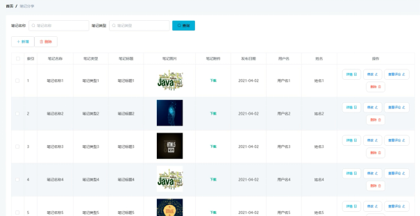管理员可增删改查笔记分享信息,笔记分享管理界面展示如图所示。