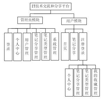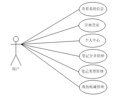 用户进入本系统可查看系统信息,包括首页、笔记分享,注册登录后主要功能模块包括个人中心、笔记分享管理、笔记类型管理以及我的收藏管理,用户用例图如图所示。