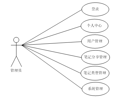 管理员登录后可对系统进行全面管理,管理员主要实现的功能模块包括个人中心、用户管理、笔记分享管理、笔记类型管理以及系统管理五大部分,管理员用例图如图所示。