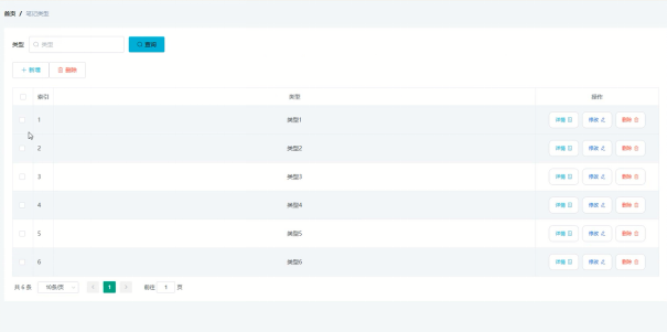 管理员可增删改查笔记类型信息,笔记类型管理界面展示如图所示。