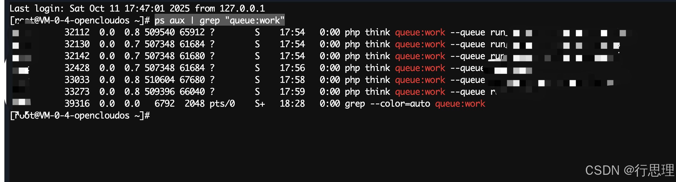 可以通过如下命令查下队列进程“queue:work”,命令如下:
