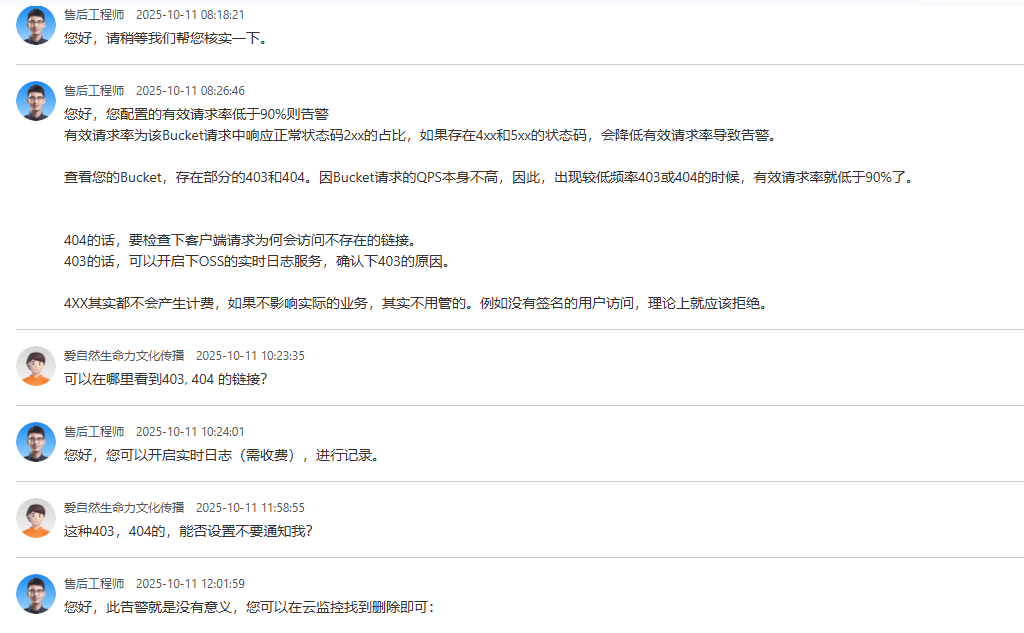 2025-10-10 下午开始,不断有阿里云的OSS警报短信和邮件,本来也没觉得什么,偶尔还是有发生的。但到了第二天早上,还是有大量的短信和邮件,觉得不正常了,跟阿里云提了个工单,要求解决,阿里云的工程师的说法是有比较多的403, 404 请求,关闭就可以了。