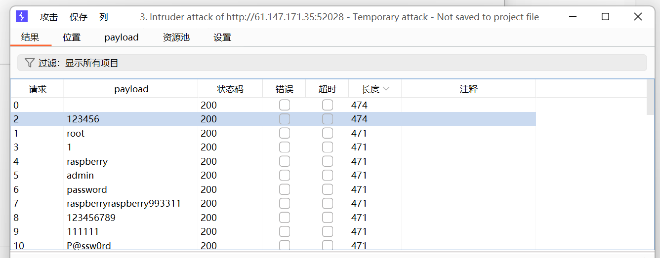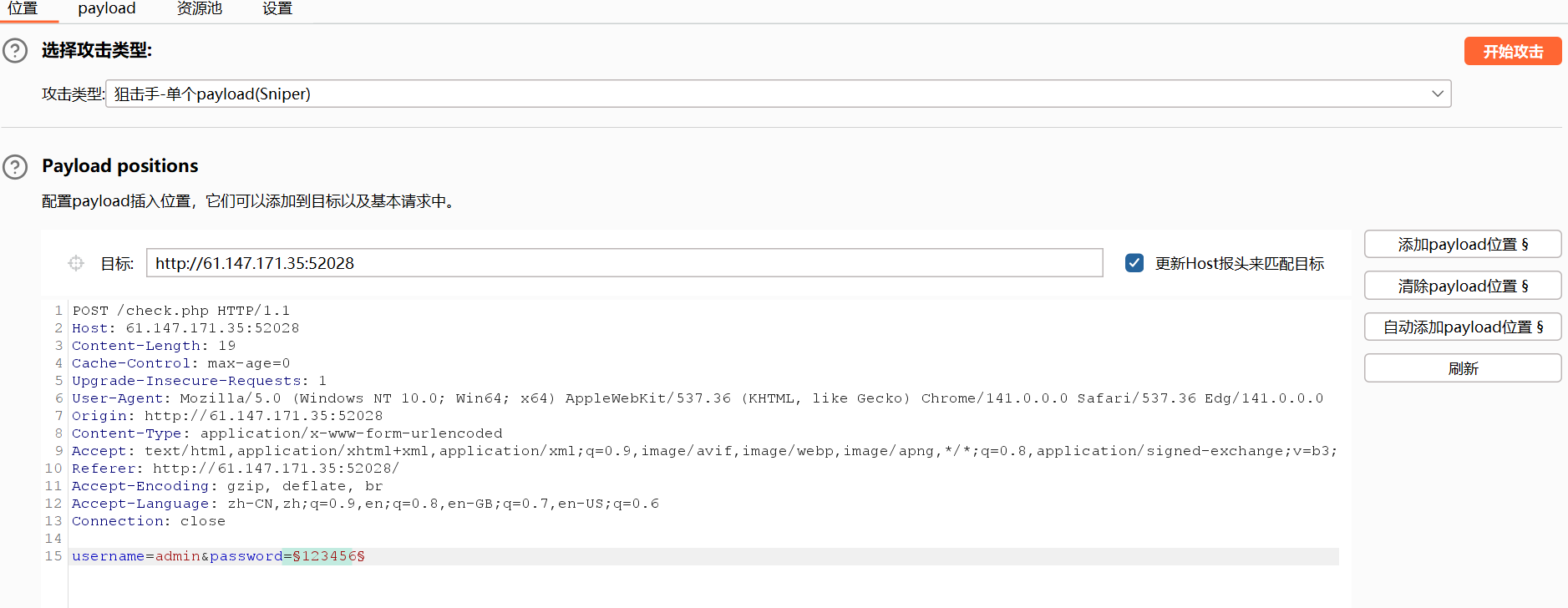 由于提示密码错误证明admin是账户名所以直接对密码进行爆破,在等号后面添加paylod位置和错误的密码后面添加paylod,点击payload