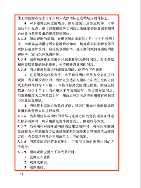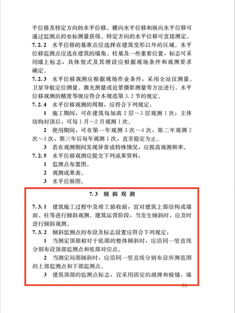 (3)倾斜观测的周期,宜根据倾斜速率每1月~3个月观测1次。当出现基础附近因大量堆载或卸载、场地降雨长期积水等导致倾斜速度加快时,应提高观测频率。施工期间倾斜观测的周期和频率,宜与沉降观测同步。