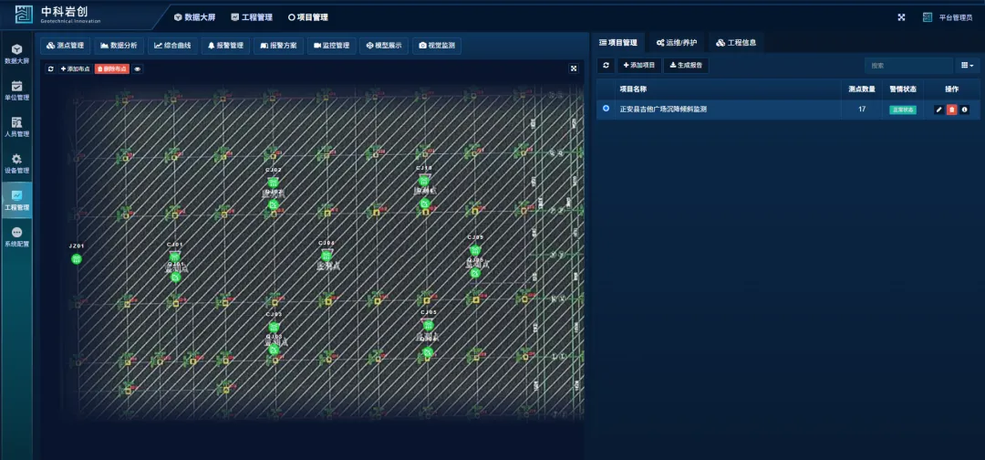 本项目通过岩创可视化云平台观查数据,根据设置报警值,数据变化达到预警值时通过电话、短信等的方式及时通知,提供有效预警,提高了建筑管理的效率和安全性,构建一个全面的安全监测体系;我们将持续创新,以提供更有力的技术保障。