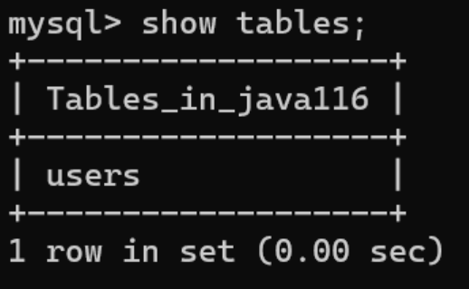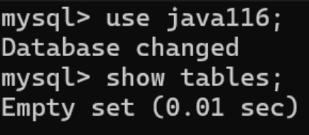 首先我们先使用我们的数据库java116,由于我库没有创建表 就查询, 所以返回空。