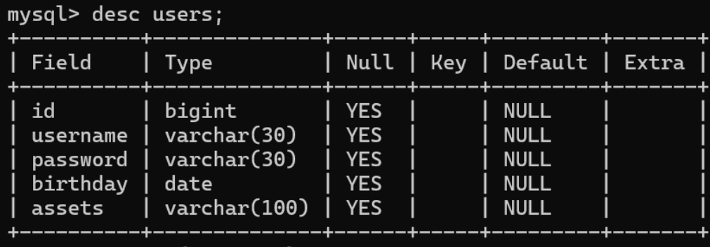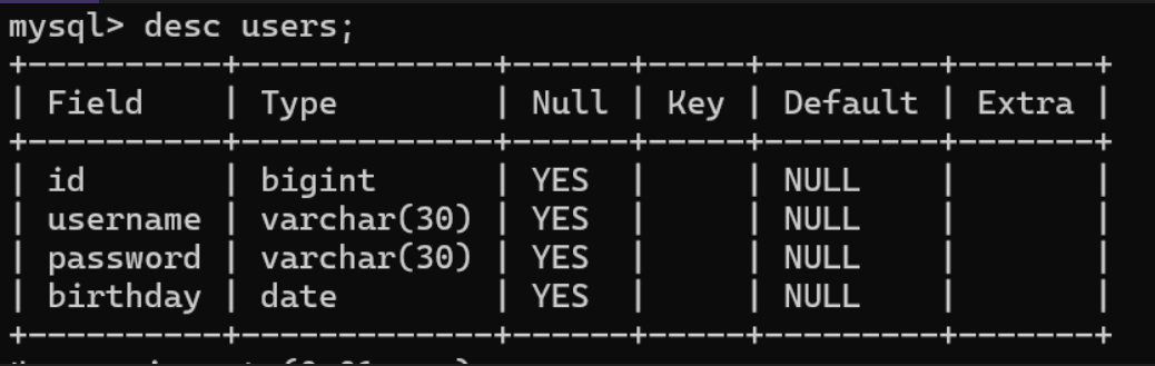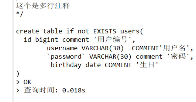 create table if not EXISTS users(id bigint comment '用户编号',username VARCHAR(30) COMMENT'用户名',`password` VARCHAR(30) comment '密码',birthday date COMMENT '生日' );