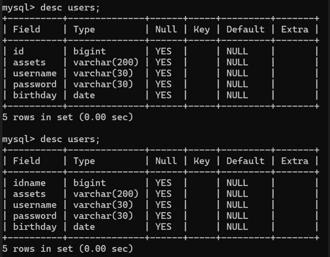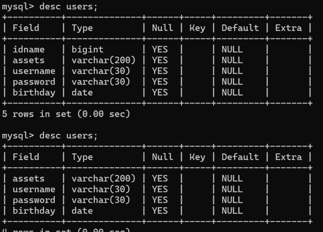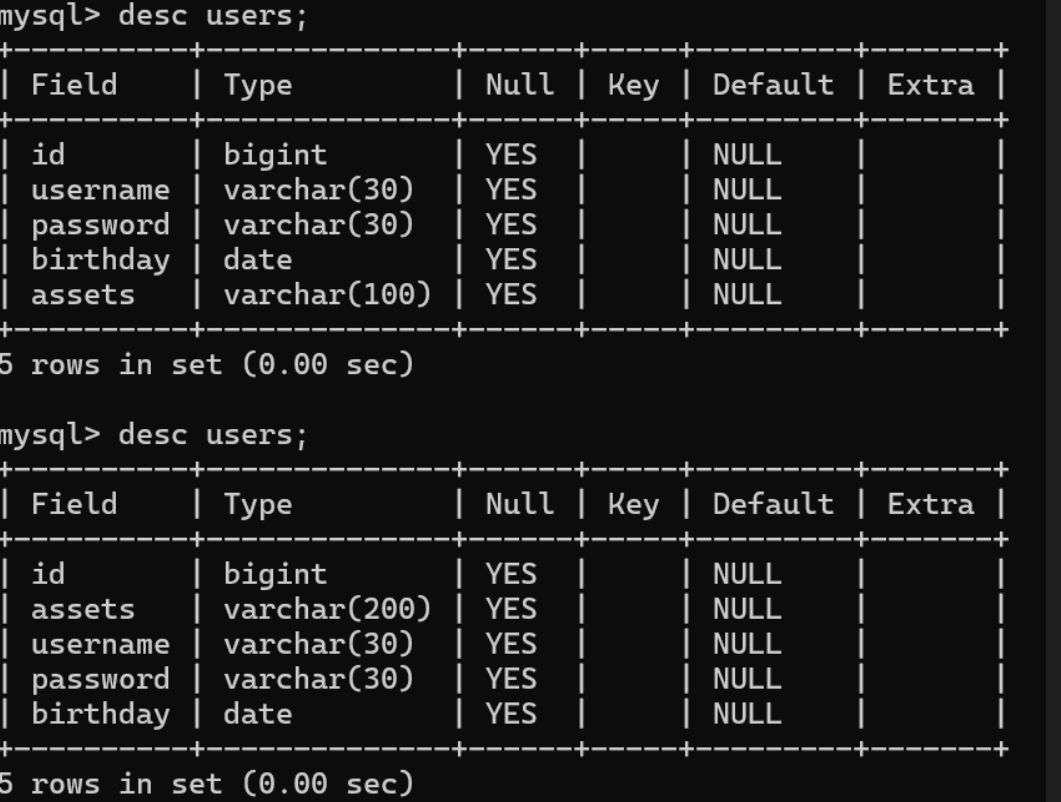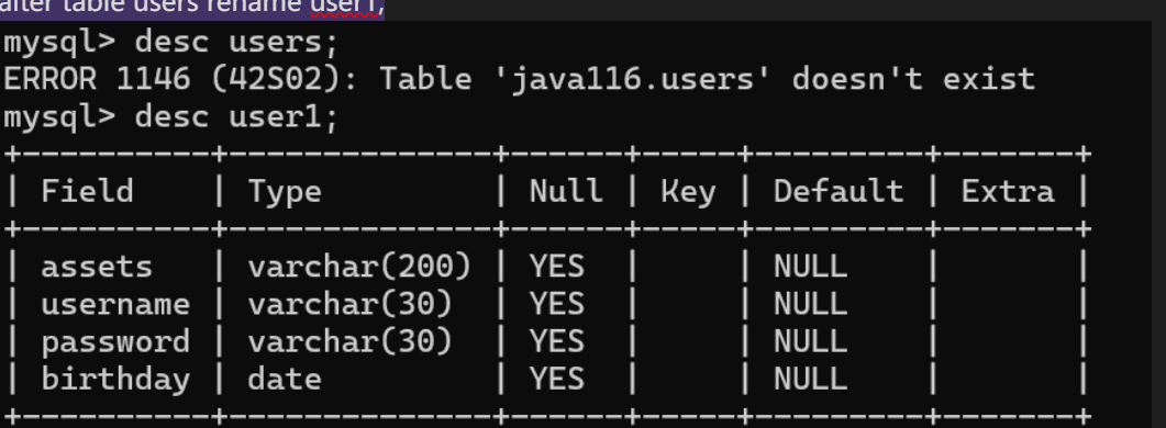 `-- 向表中末尾加入一列` `alter table users add assets VARCHAR(100) comment '头像地址' after birthday;`